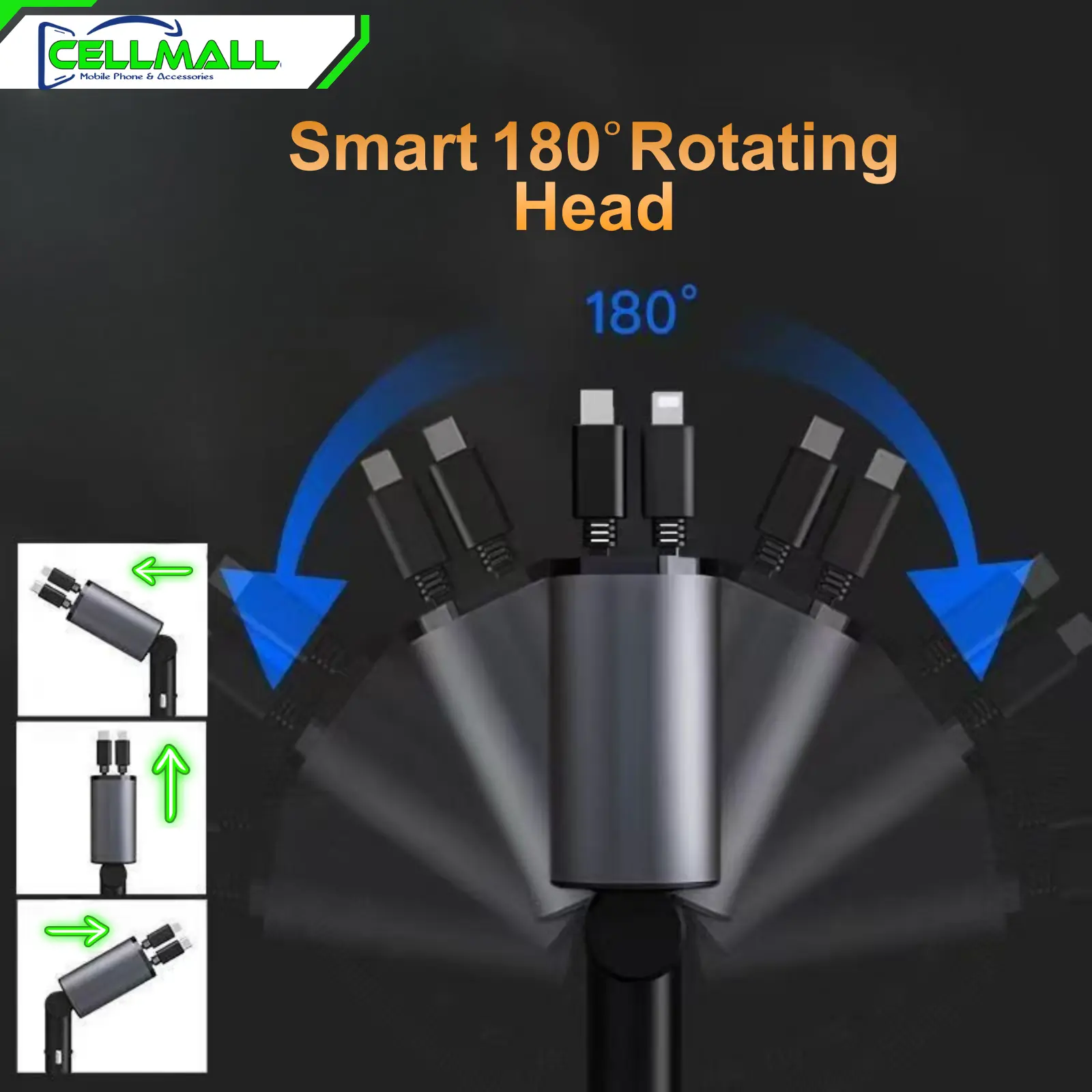 Buy Cellmall 4-in-1 retractable car charger with built-in Type-C and Lightning cables. Fast charging for iPhone, Samsung, Xiaomi & more. Cash on Delivery available in Pakistan.