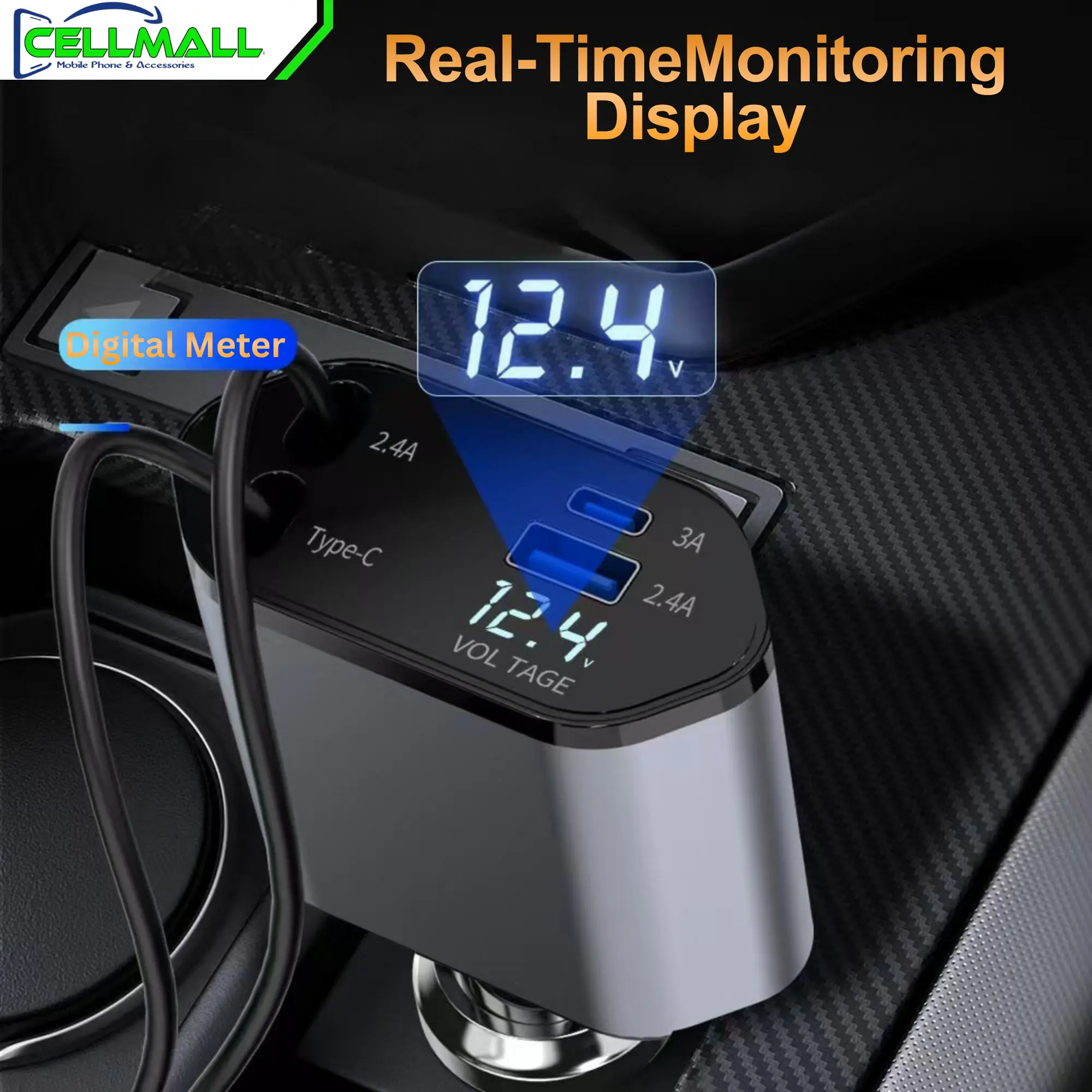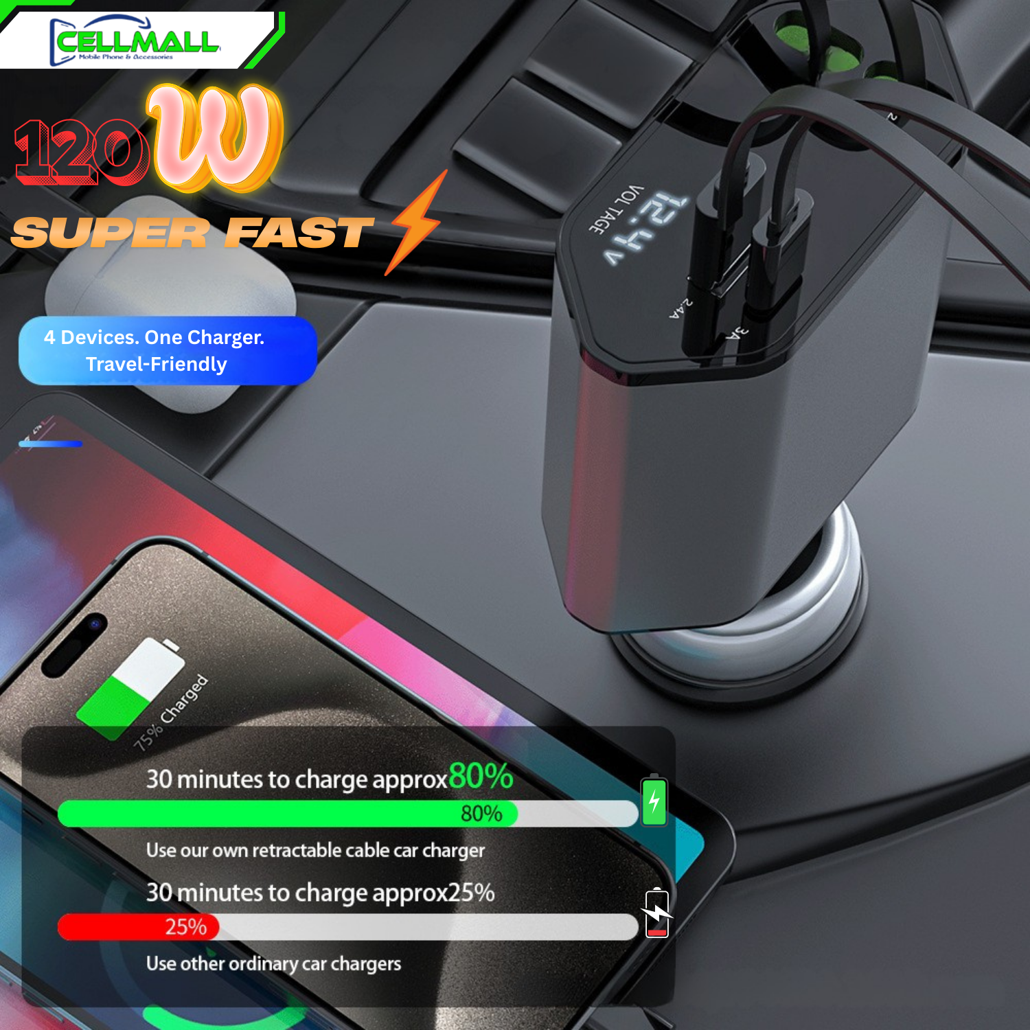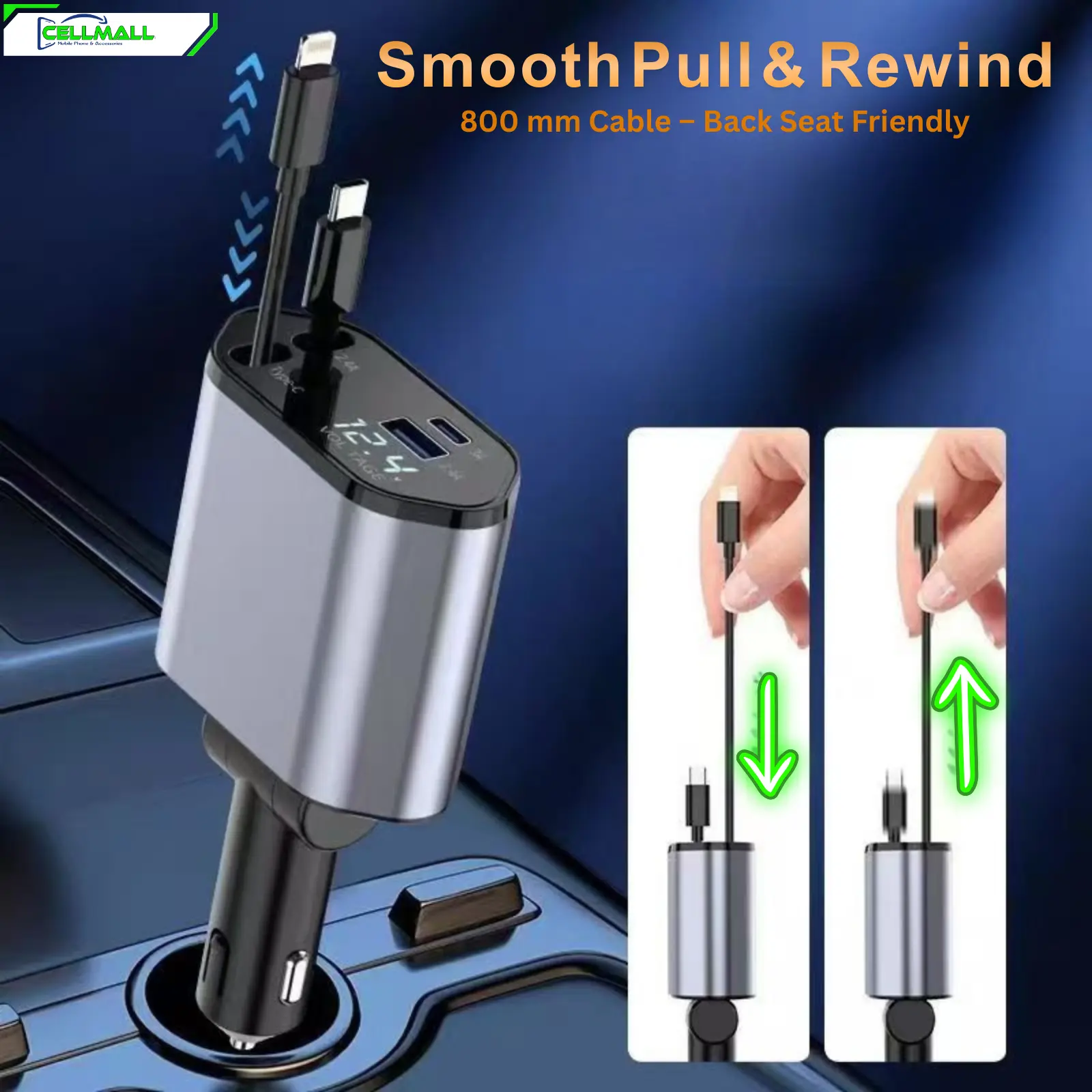 Buy Cellmall 4-in-1 retractable car charger with built-in Type-C and Lightning cables. Fast charging for iPhone, Samsung, Xiaomi & more. Cash on Delivery available in Pakistan.